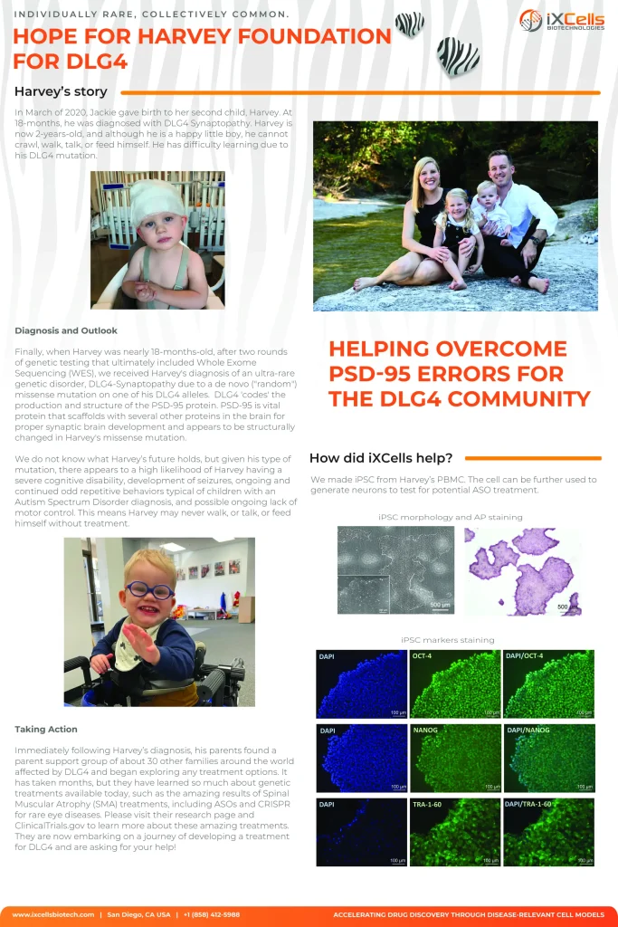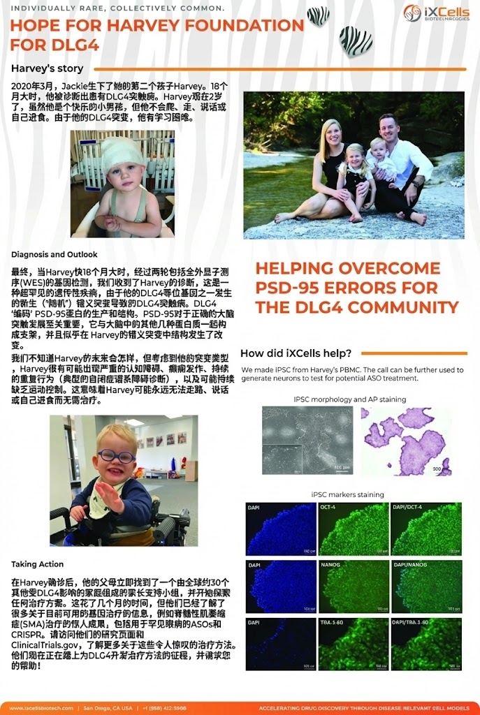 iXCells生物技术公司利用前沿的干细胞技术(iPSC)来研究和克服关键的PSD-95蛋白错误,为Harvey以及整个DLG4社区寻找潜在的基因治疗方案。